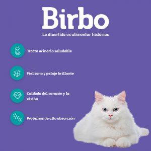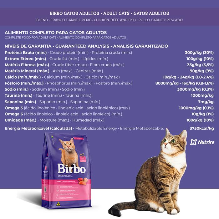 El alimento para gatos Birbo Gatos Blend es desarrollado para agradar al paladar exigente de los felinos. Alimentación completa y balanceada, con ingredientes seleccionados, proteínas de origen animal y vegetal, enriquecida con vitaminas y minerales en niveles adecuados para los gatos adultos. Birbo Gatos Mix posee Taurina, aminoácido esencial para la dieta de los gatos que auxilia en el mantenimiento de la salud visual y cardíaca y contiene extracto de Yucca Schidigera, que actúa en nivel intestinal, reduciendo el olor de la materia fecal.