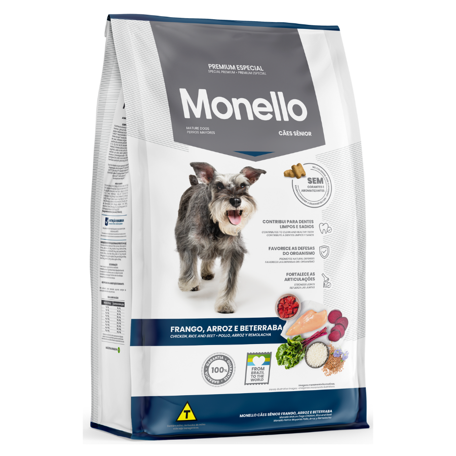 El alimento para perro Monello Dog Senior Pollo, Arroz y Remolacha, a pesar de no contener especificación de edad, Monello Perros Senior Pollo, Arroz y Remolacha está desarrollada especialmente para las mascotas que ya redujeron el ritmo de los juegos. Pensando en el bienestar de los perros y en una alimentación más sabrosa, el formato de las croquetas facilita la masticación. La adición de hexametafosfato de sodio protege la salud bucal, combate el sarro y el mal aliento y fortifica los dientes. La fórmula posee huevos en polvo, alimento con alto valor biológico y rico en proteínas, lo cual ayuda en el suministro de nutrientes de calidad, como también la presencia de aceite de salmón, que proporciona un envejecimiento más sano a los peludos.